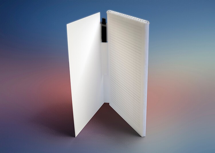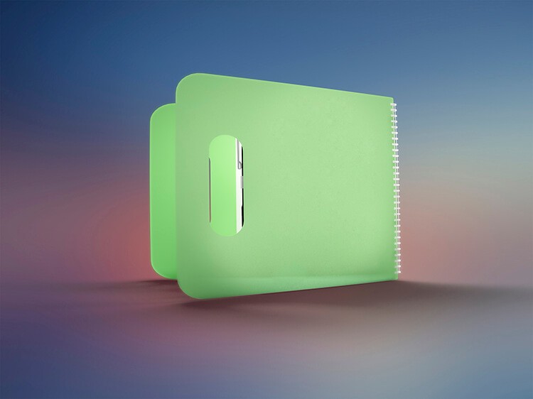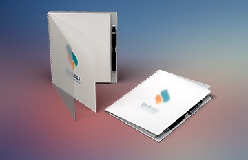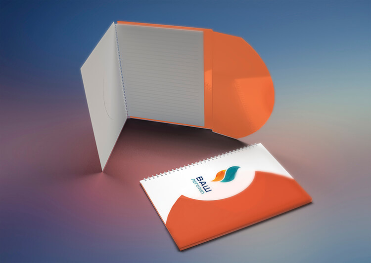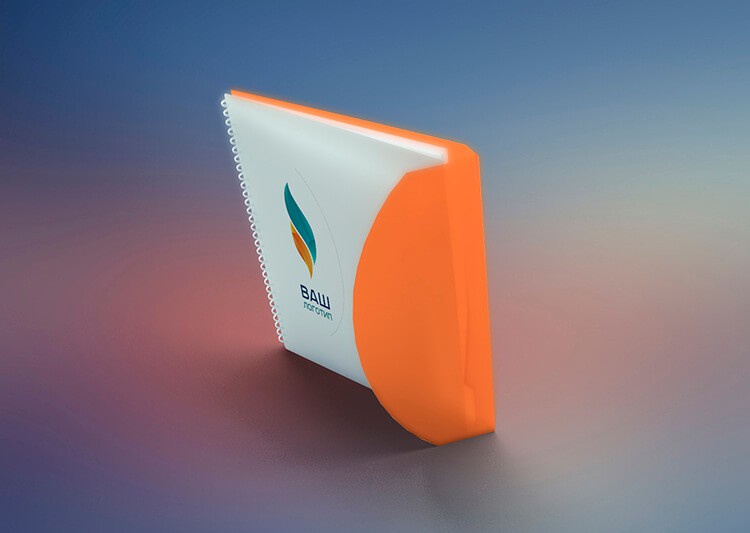 Блокнот с комбинированными обложками и брошюровкой на «пружину» по длинной стороне («пружина» сбоку). Передняя обложка: мелованная глянцевая бумага плотностью 300 гр., полноцветная печать с одной стороны. Задняя обложка: пластик толщиной 0,5 мм, без печати. С помощью вырубки на передней бумажной обложке делается полукруглая высечка, а на пластиковой — скругленный край, который, заходя в высечку, удобно закрывает блокнот. Внутренний блок: объем 50 листов, немелованная бумага «ВХИ» плотностью 80 гр.
