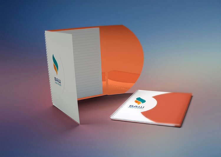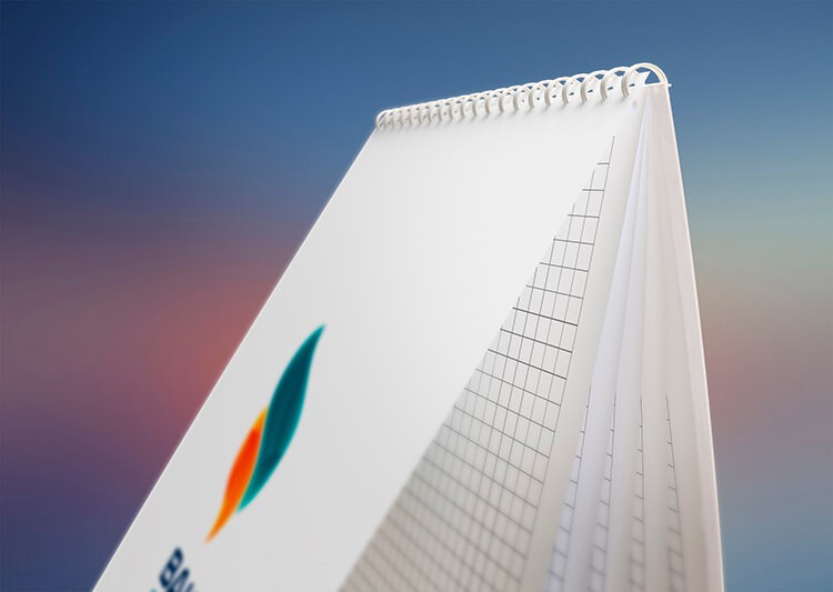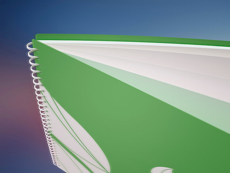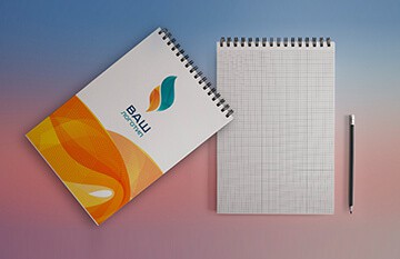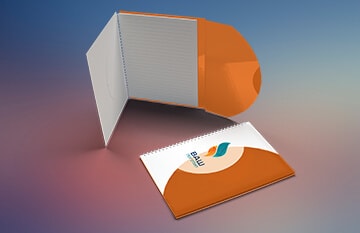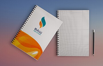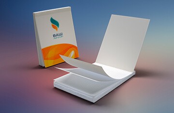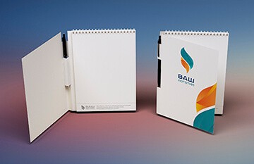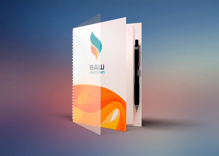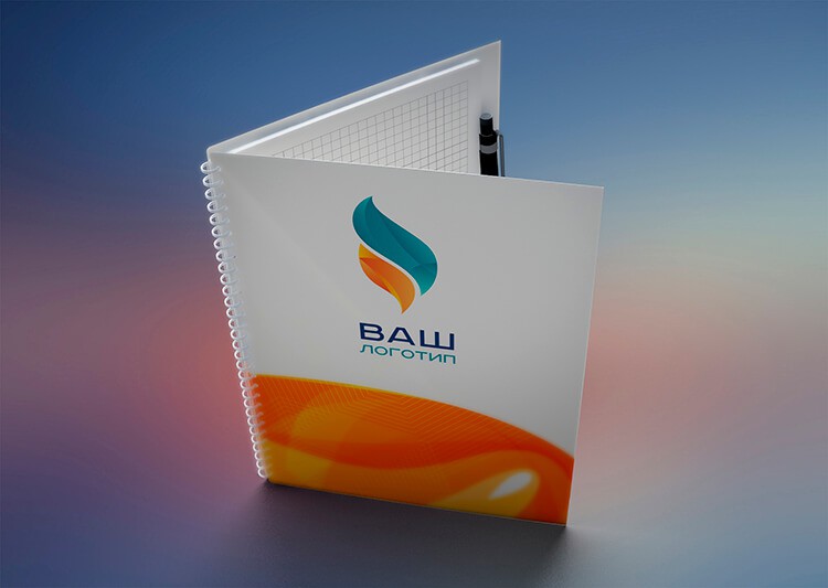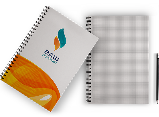 Блокнот с брошюровкой на «пружину» по короткой стороне («пружина» сверху). Передняя обложка: мелованный двухсторонний картон плотностью 270 гр., полноцветная печать с одной стороны. Задняя обложка: мелованный двухсторонний картон плотностью 270 гр., без печати. Внутренний блок: объем 50 листов, немелованная бумага «ВХИ» плотностью 80 гр.