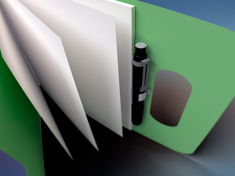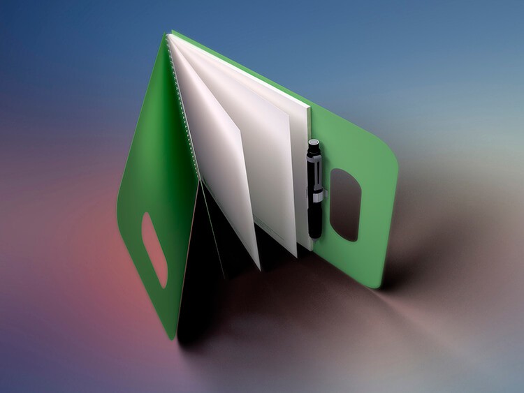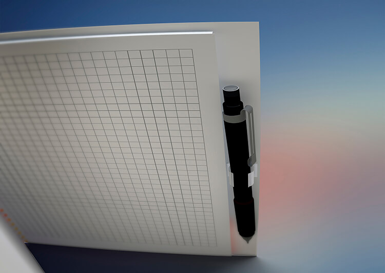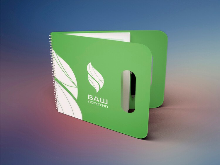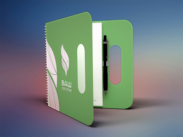 Блокнот с вырубной обложкой и брошюровкой на «пружину» по короткой стороне («пружина» сверху). Цельная обложка вырубная и схема вырубки (конструкция обложки) такова, что в сложенном виде на обложке образуется специальный карман, выступающий в качестве держателя для авторучки. Материал обложки — мелованный двухсторонний картон плотностью 270 гр., полноцветная печать с одной стороны. Внутренний блок: объем 50 листов, немелованная бумага «ВХИ» плотностью 80 гр.