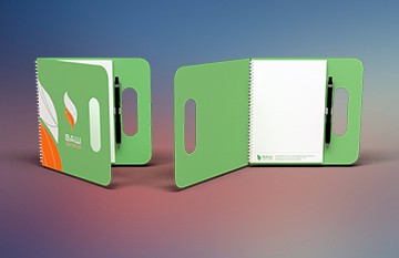 Блокнот с пластиковыми вырубными обложками и брошюровкой на «пружину» по длинной стороне («пружина» сбоку). С помощью вырубки на обложке образуются скругленные углы и отверстие для удобной переноски блокнота. Передняя обложка: пластик толщиной 0,5 мм, трафаретная печать в 1 краску с лицевой стороны. Задняя обложка: пластик толщиной 0,5 мм, без печати. Внутренний блок: объем 50 листов, немелованная бумага «ВХИ» плотностью 80 гр. Пластиковый держатель для крепления авторучки.