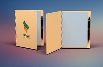 Блокнот с твёрдой обложкой и брошюровкой на «пружину» по длинной стороне («пружина» сбоку). Передняя и задняя обложки: В основе переплетный картон толщиной 1,5 мм. Сверху на основу приклеиваются верхние части обложек, отпечатанные полноцветной печатью и покрытые глянцевой или матовой плёнкой. Такой способ изготовления обложек называется технологией кашировки. В результате получается очень жёсткая обложка, стойкая к деформации. Внутренний блок: объем 50 листов, немелованная бумага «ВХИ» плотностью 80 гр. Пластиковый держатель для крепления авторучки.