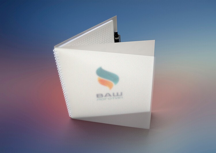 Блокнот с комбинированными обложками и брошюровкой на «пружину» по длинной стороне («пружина» сбоку). Передняя обложка: мелованная глянцевая бумага плотностью 300 гр., полноцветная печать с одной стороны. Сверху прозрачный пластик без печати. Задняя обложка: переплетный картон толщиной 1,5 мм без печати. Внутренний блок: объем 50 листов, немелованная бумага «ВХИ» плотностью 80 гр. Пластиковый держатель для крепления авторучки.