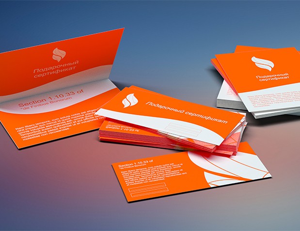 Фирменные подарочные сертификаты, отпечатанные в типографии «Артикул»: