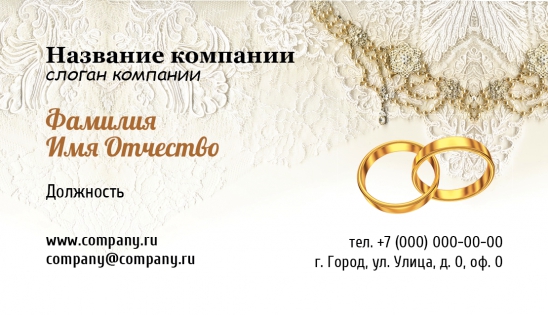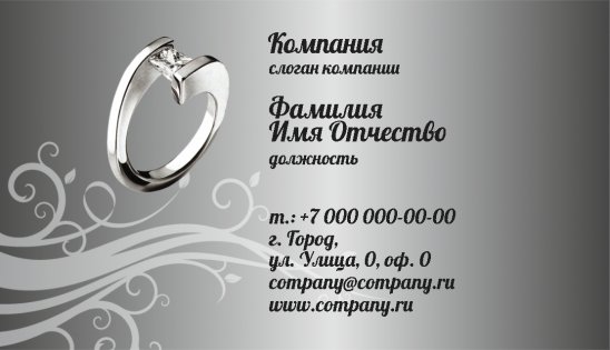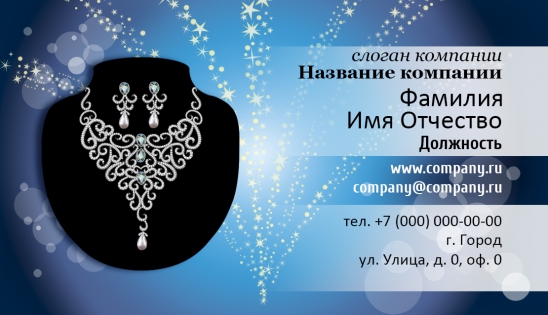 Вы также можете подкорректировать шаблон визитки для ювелира или создать свой собственный неповторимый образ, добавив слоган компании или любую другую информацию, которую считаете необходимой для клиента! С помощью самого дешевого и действенного способа – шаблона визитки для ювелирных салонов – вы сможете расширить круг своих клиентов и избавить себя от суеты!