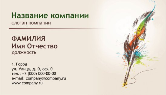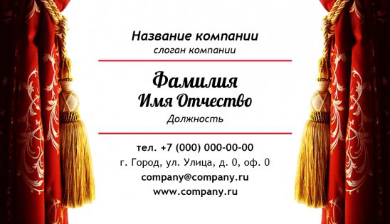 В данном разделе вы найдете визитки категории «Культура», предназначенные для использования в разных направлениях: «Изобразительное искусство», «Танцы, хореография, балет», «Блоггеры, писатели», «Боди-арт», «Антиквариат», «Кинотеатры», «Музыка», «Скульптура», «Театры». Каждая визитная карточка имеет соответствующее дизайнерское оформление. Единожды увидев визитку, можно сразу догадаться, к какой отрасли она относится.