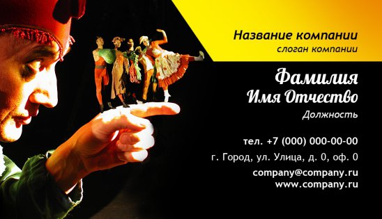 По вашему желанию наша компания разместит на макете ваш слоган или логотип вашего театра, если же вы свободный деятель искусства, то вы также можете создать собственный театр на своей визитке, заказав красочный макет. Вашему клиенту или партнеру будет легко и просто связаться с вами, а вам не придется каждый раз диктовать или записывать свой номер при необходимости!