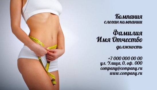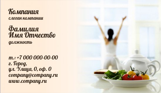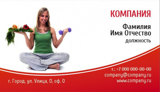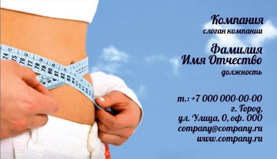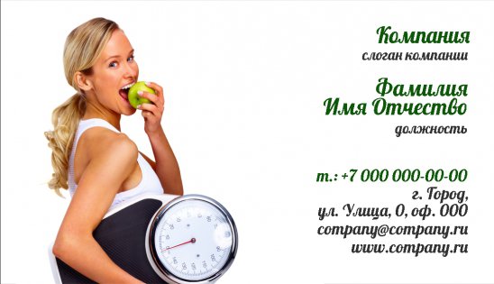 Вы также можете подкорректировать шаблон визитки для диетологов или создать свой собственный неповторимый образ, добавив слоган компании или любую другую информацию, которую считаете необходимой для клиента! С помощью самого дешевого и действенного способа – шаблона визитки для диетологов – вы сможете расширить круг своих клиентов и избавить себя от суеты!