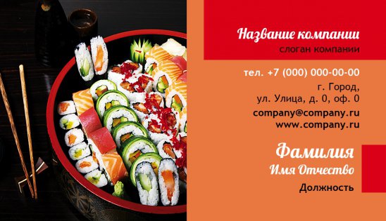 Если ваше заведение суши-бар, то вам необходимо большое количество фирменных визиток, для того, чтобы ваши клиенты смогли быстро и просто узнать о своем заказе! Именно для такой ситуации наше предложение - шаблоны визиток для суши баров от «Артикула»!