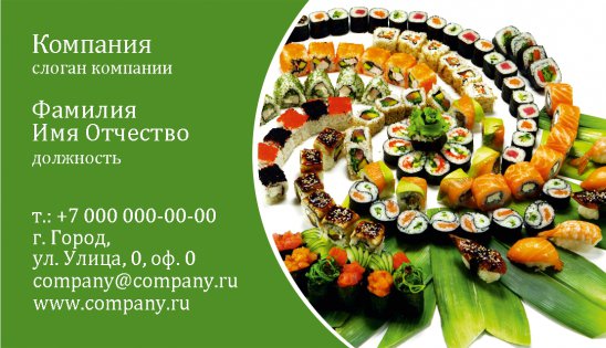 Сэкономив свое время и средства, вы сможете за сутки обеспечить своих клиентов и партнеров своими контактами за символическую сумму! Всего лишь в несколько кликов вы сможете выбрать из нашей коллекции уникальных макетов шаблон визитки для суши баров, заполнить его необходимой контактной информацией, добавив по желанию слоган или логотип компании, и оформить заказ в режиме онлайн! Ровно через сутки ваш суши бар будет снабжен высококачественной полиграфической продукцией. А ваши клиенты и партнеры всегда будут с вами на связи!