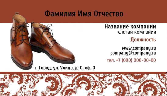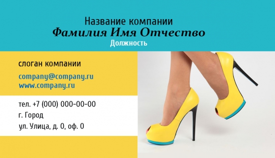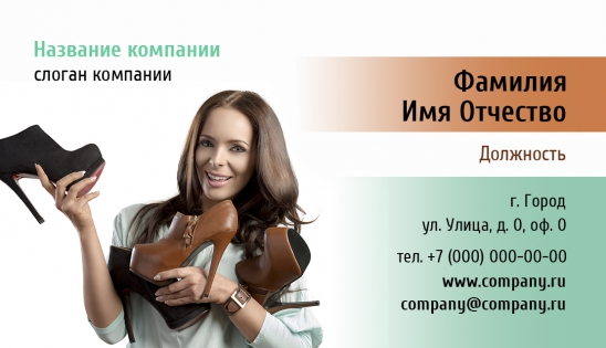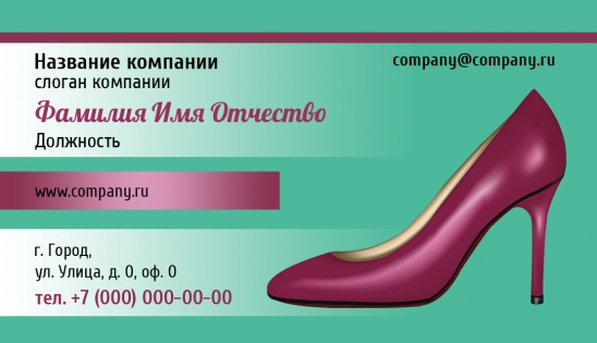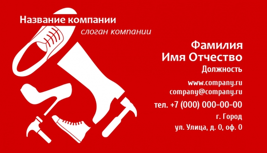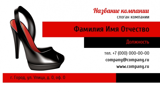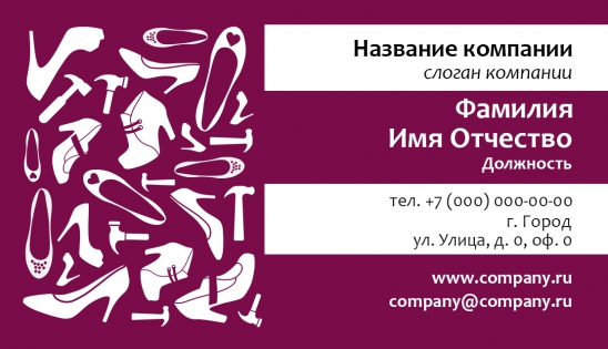 Вы также можете подкорректировать шаблон визитки для обуви или создать свой собственный неповторимый образ, добавив слоган компании или любую другую информацию которую считаете необходимой для клиента! С помощью самого дешевого и действенного способа – шаблона визитки для магазина обуви – вы сможете расширить круг своих клиентов и избавить себя от суеты!